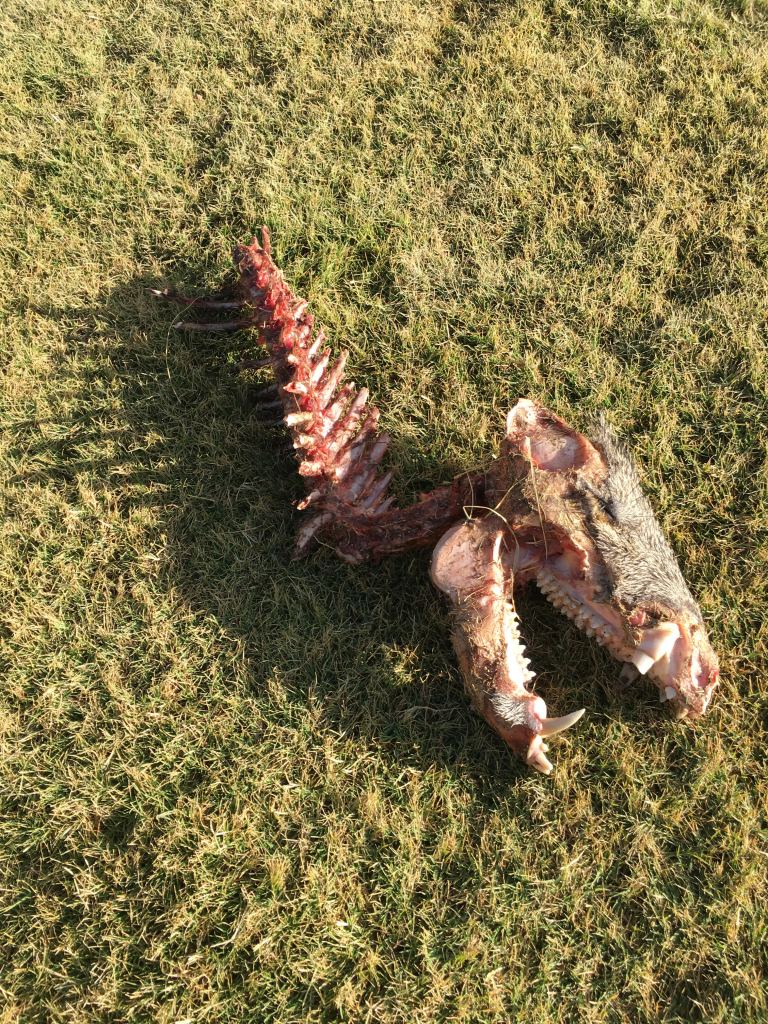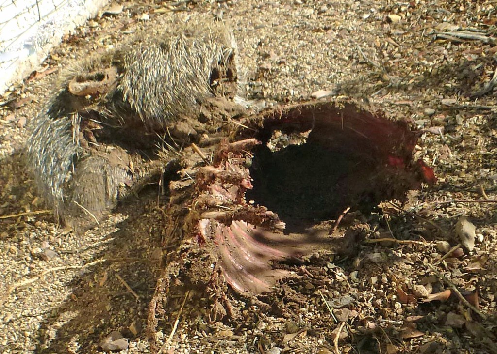 The next morning, I discovered that the remains of the Javelina had been moved from the ravine to a grassy patch near our house, suggesting that some coyotes had found and finished off the creature.