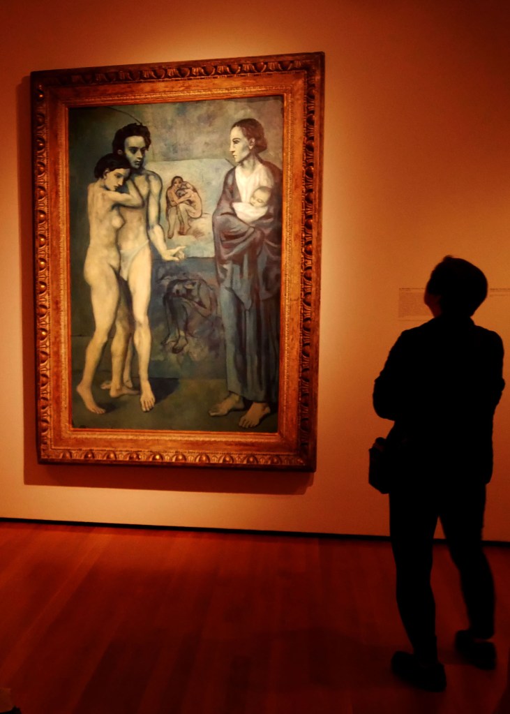 The following image, “La Vie” was painted more than 120 years ago and is now in the Cleveland Museum of Art permanent collection. It is flanked by Picasso’s study drawing for this work. He considered different groups of people and different poses before paining La Vie