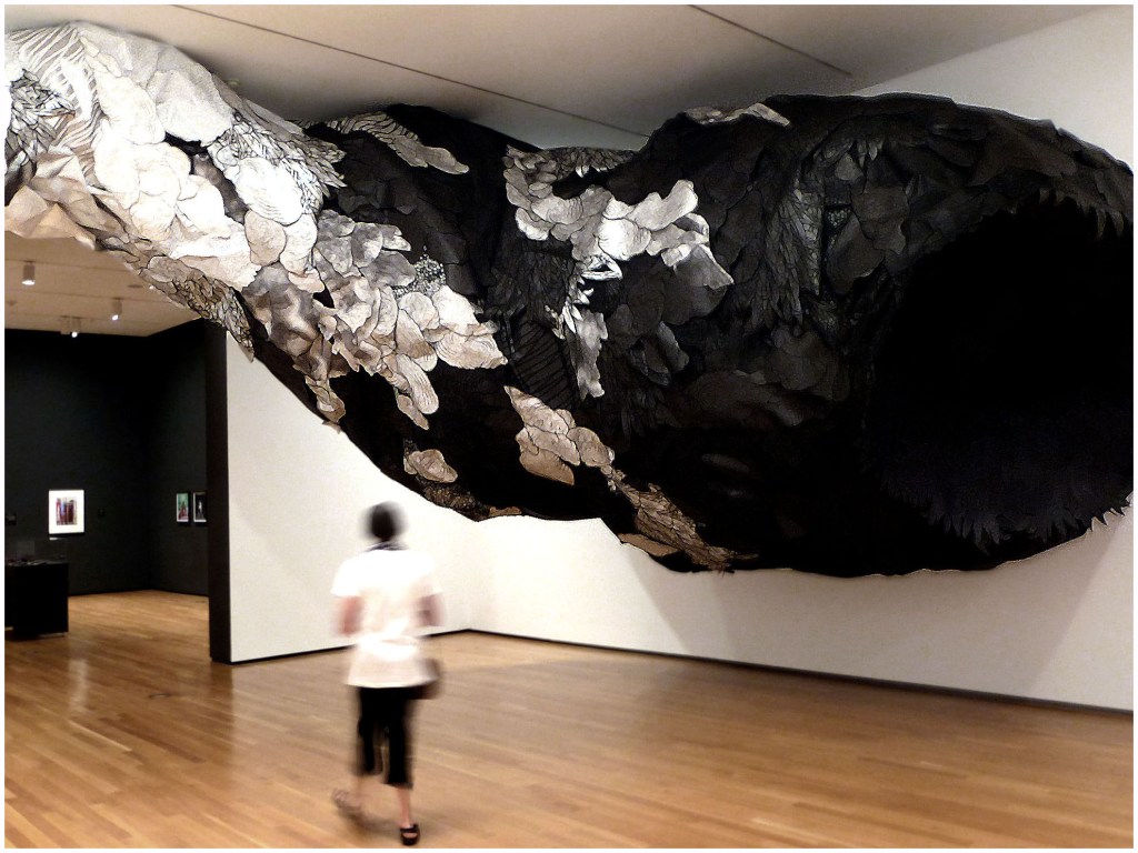 And again, below, the relationship between a human subject and an artistic installation stimulates an emotional response. Scale, color, and movement create a sense of foreboding.