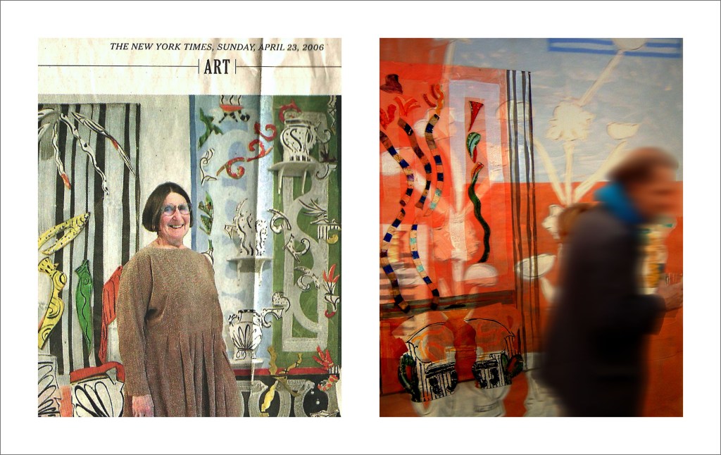On the left is part of a newspaper clipping from the time, and I created the panel on the right by superimposing two photographs, one I took at the vernissage, and the other taken in her studio.