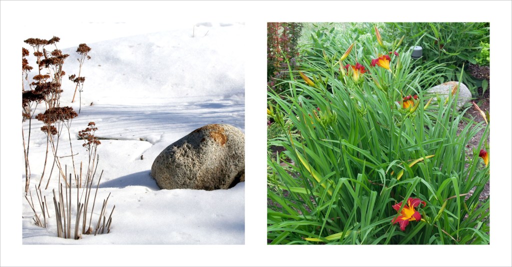 It was like yesterday, looking out the bedroom window: A rock and a few bare stalks in the winter snow. Now, life has returned. The rock is barely visible in the dense overgrown garden behind a clump of day lilies. These flowering plants, native to Asia, aren’t true lilies. They are prolific perennial bulbous plants whose flowers typically last only a day only to be replaced by new ones: Something like our own short lives.