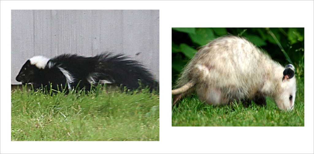Skunks and Possums are both nocturnal mammals, so we seldom see them, although the skunk can make its presence known by spraying a foul-smelling liquid as a defense mechanism. The possum, on the other hand, will ‘play dead’ when threatened. In this image, one can see that the possum is a female marsupial by the pouch under its stomach in which it is carrying its young.