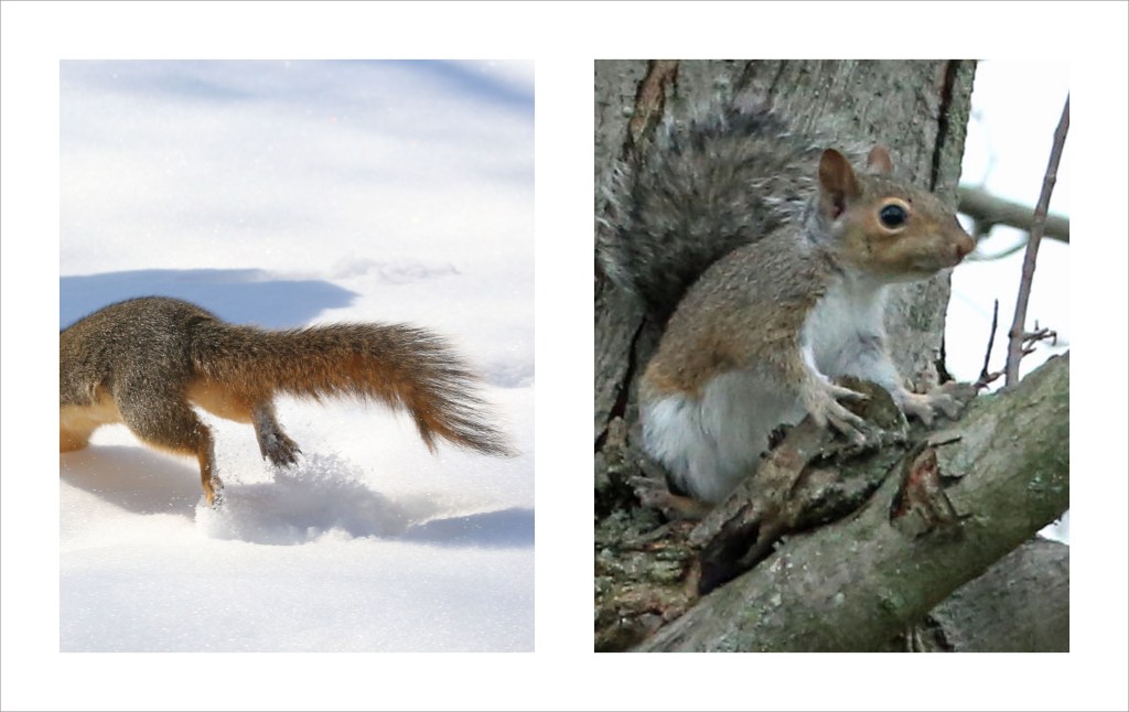 We see squirrels foraging for seed below the birdfeeders in winter. Their nests are often constructed of twigs and leaves in the fork of a tree or, in the case of our squirrel, in a hole in the lower trunk of a large maple tree.