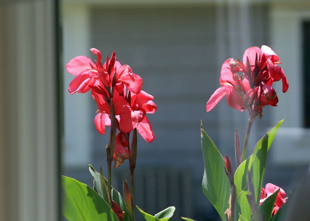 This Cana plant isn’t in the flower bed but in its own pot next to a tomato vine. We planted it in spring and expect it to continue enjoying its tropical-like green foliage and brilliant flowers until the first frost of autumn. Like the tomato vine, the Cana is so close to one of the windows of the sunroom, it could almost be in the room.