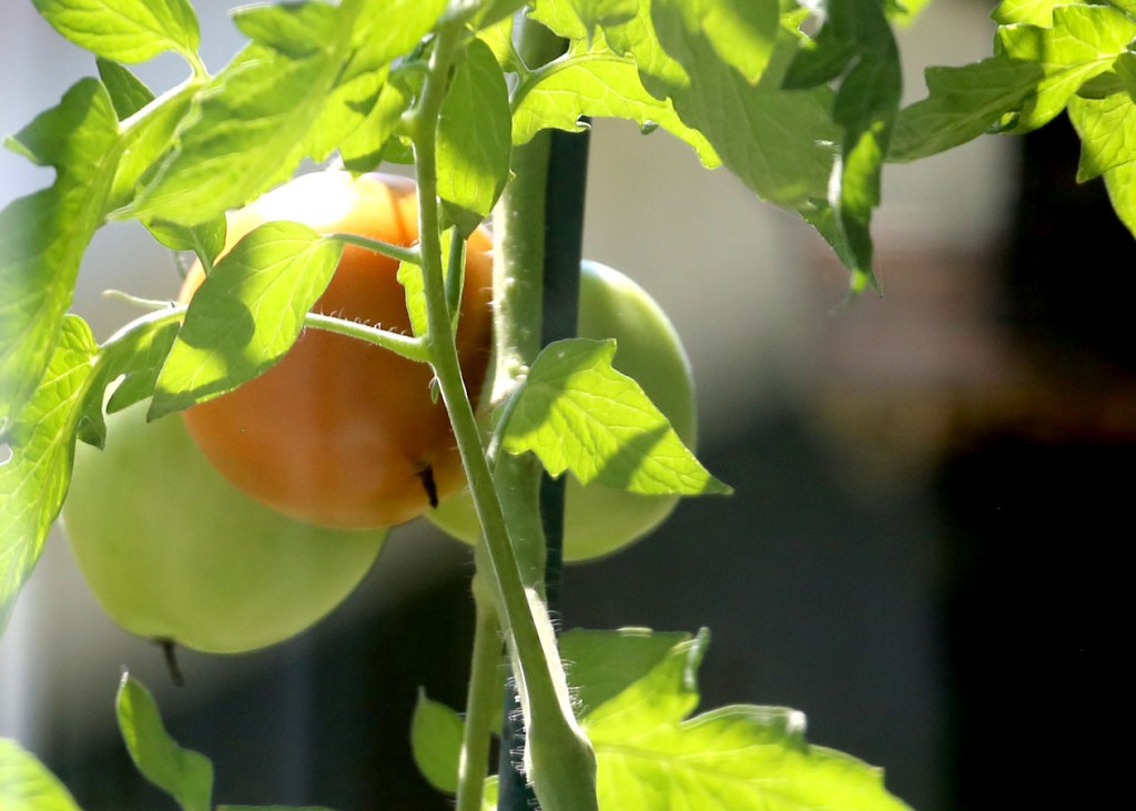 Turning around in the chair, I look out at another tomato vine. This one produces smaller slicing varieties in abundance
