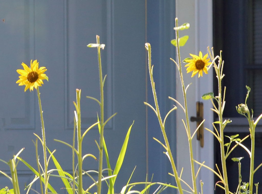 Beyond our own flower garden, a few sunflowers that our neighbor planted in her vegetable bed adds to the color of our surroundings.