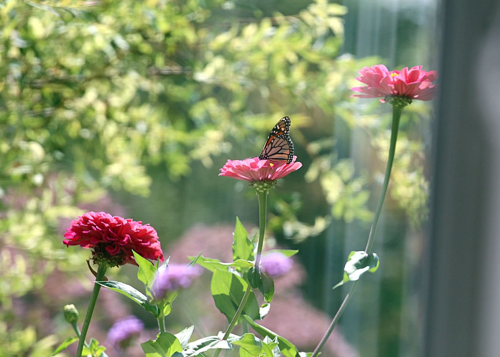 Speaking of butterflies, here is a Monarch settled on a Zinnia flower. Over the past few days, we have noticed lots of activity as the fourth generation of butterflies prepare for their long migration to Mexico.