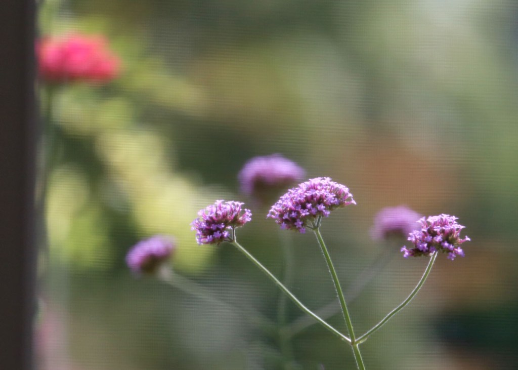 A blurry image through the window-screen of the tall, slender, stems of a Verbena with its cluster of purple flowers. It is a nectar source for butterflies and hummingbirds. A late-summer bloomer, it brings some nice color to the garden as other earlier blooming flowers begin to fade.
