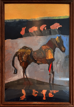 John’s characteristic messenger is the Yei Be Chei, an ethereal messenger to the Navajo. Since exact replication of the sacred icon is taboo, he modifies the image to the satisfaction of his tribe’s spiritual leaders. According to collectors, the alteration does not affect the impact of the painting’s message.