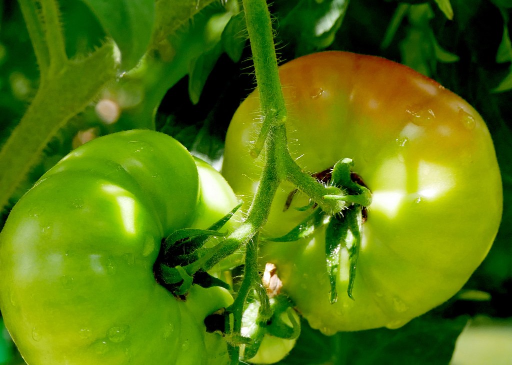 A final pairing on today’s walk around the house: Two tomatoes in a pot, green but turning red: A sign of many more warm summer days to come.