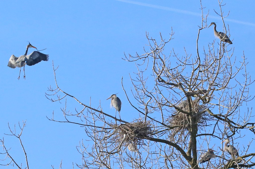 The rain has stopped on a warm spring day and it’s a good time for a walk to the lake and forest just five minutes from home. The Great Blue Heron sees me coming and, quietly lifting its body into the air, flies low above the water to a tree on the other side of the lake. I remember visiting its breeding place not far away where with more than ten other heron pairs it built its nest.