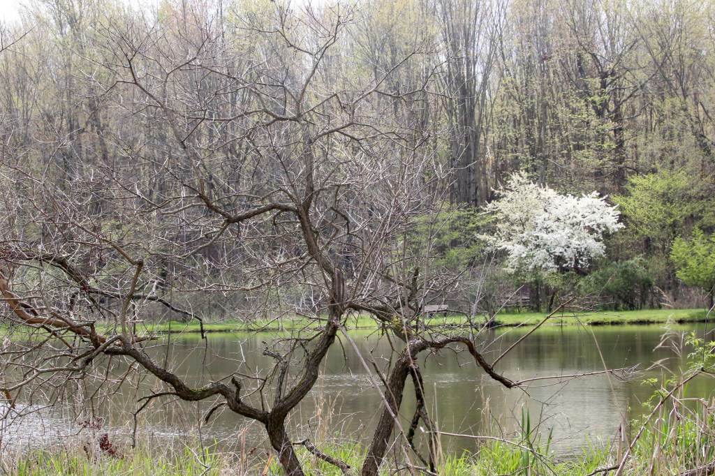 On the far side of the lake, a flowering pear tree joins in the celebration of spring