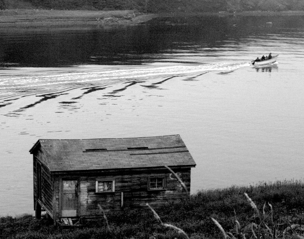 In the photograph a boat is seen leaving a wake of successive shallow waves as it heads out to sea. The waves ripple outward, ever shallower, towards the derelict and abandoned boat-house on the bank of the inlet. A few tall grasses in the foreground lean leftward as if calling the boat back. But the boat and its fishermen lean resolutely forward, drawn perhaps to an unseen source of light.